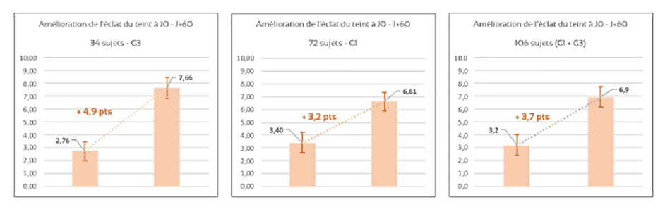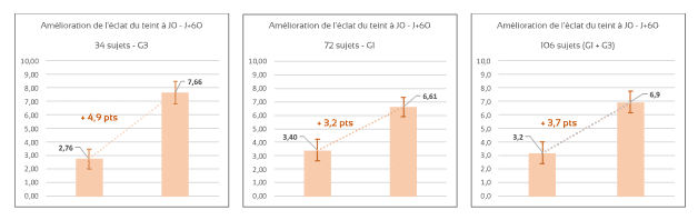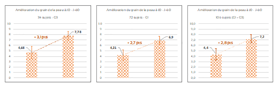 Au total, sur 106 sujets (G1+G3), on obtient une note finale de 6,9/10 qui illustre un gain de 3,7 points, soit une amélioration très significative. Ce gain est supérieur dans le G3 où les sujets ont été inclus dans l’étude pour ce motif premier (Teint/Grain) : la note à J+60 de 7,66 est 2,8 fois la note initiale.