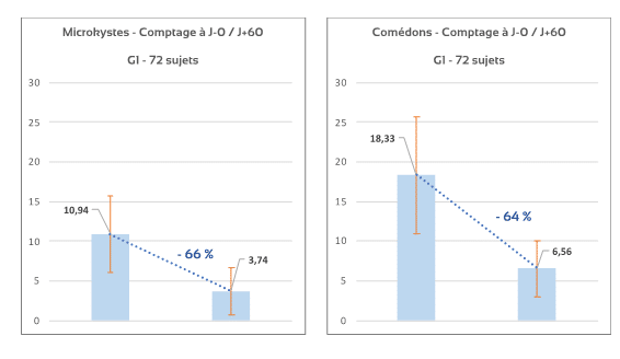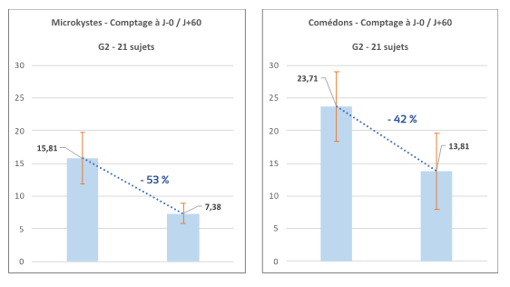 On notera de forts écarts-types en raison de la grande variabilité des sujets, 25 % d’entre eux ayant plus de 50 ans dans ce groupe avec un rapport comédons/microkystes de 3,7 alors que ce rapport est de 1,7 pour l’ensemble du groupe 1 à J0 et de 1,8 à J+60 jours.