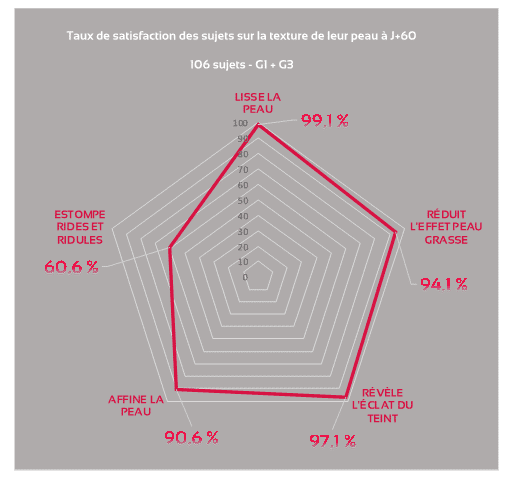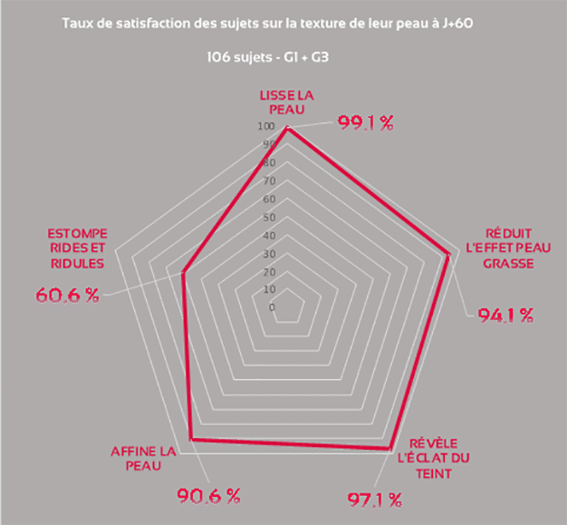 Lors du bilan réalisé pendant la seconde consultation, à J+60, les dermatologues investigateurs ont recueilli l’avis des sujets à propos des principales allégations qui fondent la qualité de l’aspect de la peau.